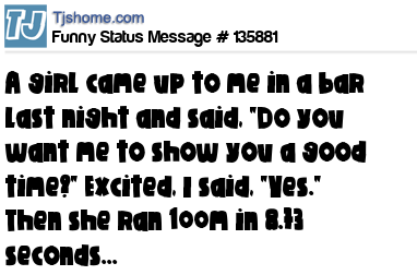 X says A girl came up to me in a bar last night and said, "Do you want me to show you a good time?" Excited, I said, "Yes." Then she ran 100m in 8.73 seconds...