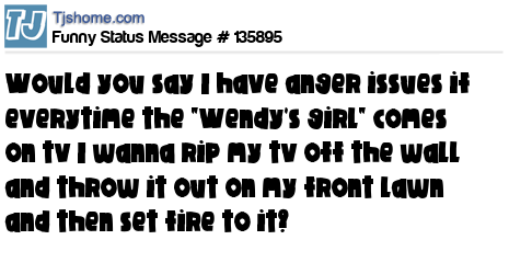 - # 135902 would you say I have anger issues if everytime the "Wendy's girl" comes on I have this urge to rip my tv off the wall and throw it out the window and then run outside and set it on fire?