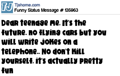 X has Dear teenage me, It's the future. no flying cars but you will write jokes on a telephone.. No don't kill yourself, it's actually pretty fun