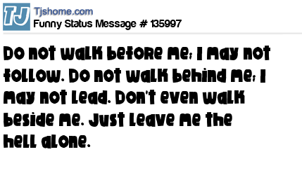 - # 166203 Don't walk behind me, for I may not lead. Do not walk ahead me, for I may not follow. Do not walk beside me either. Just pretty much leave me the hell alone.