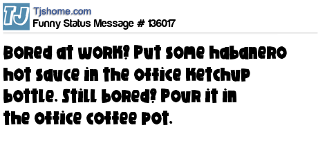 X Bored at work? Put some habanero hot sauce in the office ketchup bottle. Still bored? Pour it in the office coffee pot.