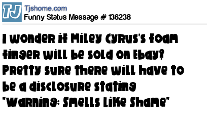 X I wonder if Miley Cyrus's foam finger will be sold on Ebay? Pretty sure there will have to be a disclosure stating "Warning: Smells Like Shame"