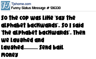 X So the cop was like 'say the alphabet backwards',, So I said 'the alphabet backwards',, Then we laughed and laughed............ Send bail money