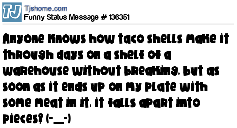 X says Anyone knows how taco shells make it through days on a shelf of a warehouse without breaking, but as soon as it ends up on my plate with some meat in it, it falls apart into pieces? (-__-)