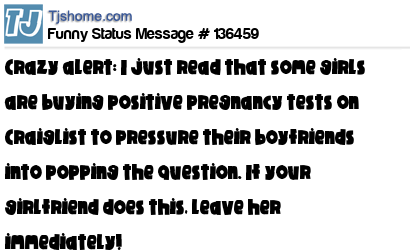 X says Crazy alert: I just read that some girls are buying positive pregnancy tests on Craiglist to pressure their boyfriends into popping the question. If your girlfriend does this, leave her immediately!