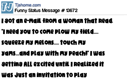 - # 183289 I got an e-mail from a woman that read, "I need you to come plow my field.... squeeze my melons.... touch my yams...and play with my peach!" I was getting ALL excited until I realized it was just an invitation to play Farmville