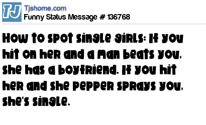 X says How to spot single girls: If you hit on her and a man beats you, she has a boyfriend. If you hit her and she pepper sprays you, she's single.