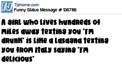 X says A girl who lives hundreds of miles away texting you "I'm drunk" is like a lasagna texting you from Italy saying "I'm delicious"