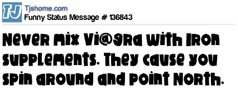 - # 208130 Never mix Viagra with Iron Supplements. It will cause you to spin around and point North.