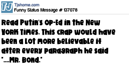 X Read Putin's Op-Ed in the New York Times. This crap would have been a lot more believable if after every paragraph he said "....Mr. Bond."