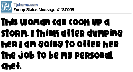 X says This woman can cook up a storm. I think after dumping her I am going to offer her the job to be my personal chef.