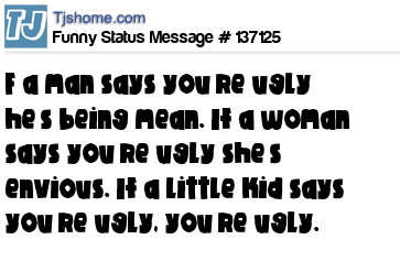 - # 143249 If a man says you're ugly he's being mean. If a woman says you're ugly she's envious. If a little kid says you're ugly, you're ugly.