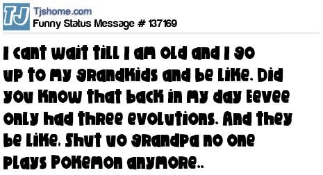 X says I cant wait till I am old and I go up to my grandkids and be like. Did you know that back in my day Eevee only had three evolutions. And they be like, Shut uo grandpa no one plays Pokemon anymore..