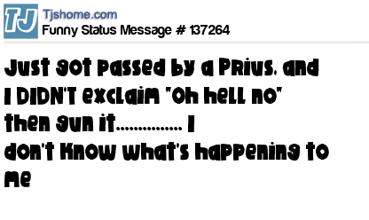 X Just got passed by a Prius, and I DIDN'T exclaim "Oh hell no" then gun it............... I don't know what's happening to me