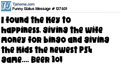 X says I found the key to happiness, giving the wife money for bingo and giving the kids the newest PS4 game.... Beer 30!