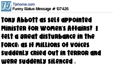 X says Tony Abbott as self appointed Minister for Women's Affairs? “I felt a great disturbance in the Force; as if millions of voices suddenly cried out in terror and were suddenly silenced”.