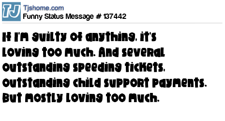 X says If I'm guilty of anything, it's loving too much. And several outstanding speeding tickets, outstanding child support payments. But mostly loving too much.