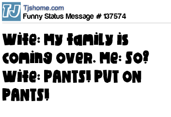 X says Wife: My family is coming over. Me: So? Wife: PANTS! PUT ON PANTS!