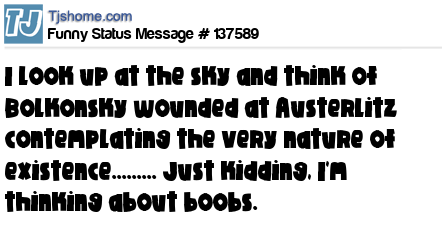 X I look up at the sky and think of Bolkonsky wounded at Austerlitz contemplating the very nature of existence......... Just kidding, I'm thinking about boobs.
