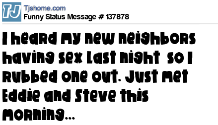 - # 138632 Neighbors just complained about the sex noise coming from our house last night. Well, the jokes on them cause I wasn't even home last night.