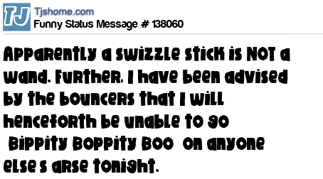 X Apparently a swizzle stick is NOT a wand. Further, I have been advised by the bouncers that I will henceforth be unable to go “Bippity Boppity Boo” on anyone else’s arse tonight.