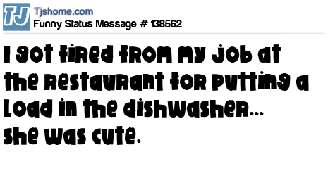 X says I got fired from my job at the restaurant for putting a load in the dishwasher... she was cute.