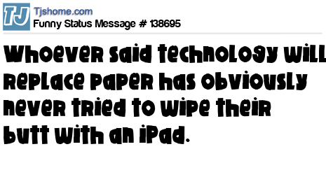 - # 118248 Whoever said technology will replace paper... has obviously never tried to wipe their ass with an iPad.