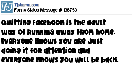 - # 24935 Quitting Facebook is the new, adult version of running away from home. We all know you're doing it for attention and we all know that you'll be back.