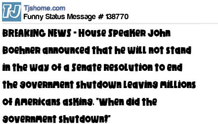 X says BREAKING NEWS - House Speaker John Boehner announced that he will not stand in the way of a Senate resolution to end the government shutdown leaving millions of Americans asking, "When did the government shutdown?"