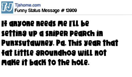 X says If anyone needs me I'll be setting up a sniper pearch in Punxsutawney, Pa. This year that fat little groundhog will not make it back to the hole.
