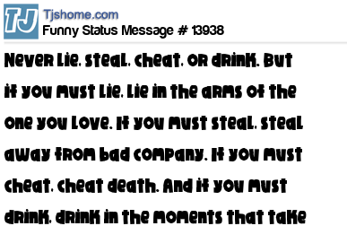 - # 42392 Never lie, steal, cheat, or drink... But if you must lie, lie in the arms of you love. If you must steal, steal away from bad company. If you must cheat, cheat death., and if you must drink, drink in the moments that takes your breath away....