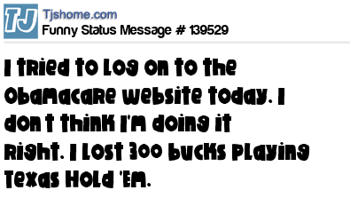 X says I tried to log on to the Obamacare website today. I don’t think I'm doing it right. I lost 300 bucks playing Texas Hold 'Em.
