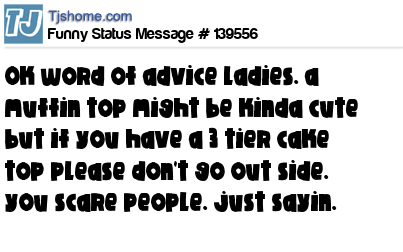 X Ok word of advice ladies. a muffin top might be kinda cute but if you have a 3 tier cake top please don't go out side. you scare people. just sayin.