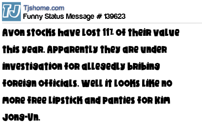 X Avon stocks have lost 11% of their value this year. Apparently they are under investigation for allegedly bribing foreign officials. Well it looks like no more free lipstick and panties for Kim Jong-Un.