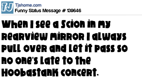 X says When I see a Scion in my rearview mirror I always pull over and let it pass so no one's late to the Hoobastank concert.