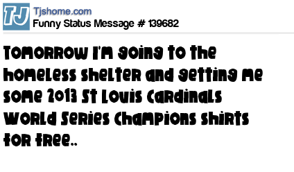 X Tomorrow I'm going to the homeless shelter and getting me some 2013 St Louis Cardinals World Series Champions shirts for free..