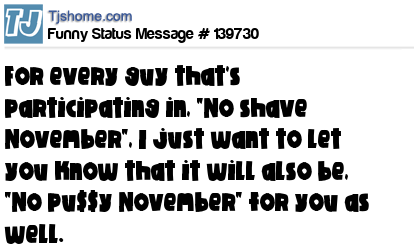 X For every guy that's participating in, "No shave November", I just want to let you know that it will also be, "No pu$$y November" for you as well.