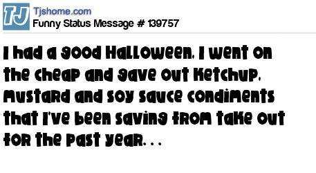 X says I had a good Halloween, I went on the cheap and gave out ketchup, mustard and soy sauce condiments that I've been saving from take out for the past year. . .