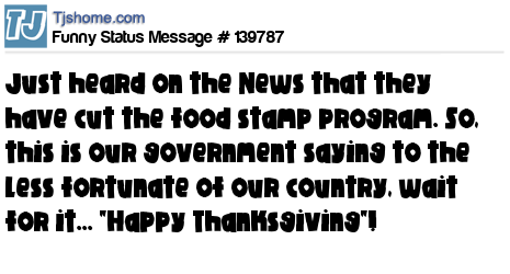 X has Just heard on the News that they have cut the food stamp program. So, this is our government saying to the less fortunate of our country, wait for it... "Happy Thanksgiving"!