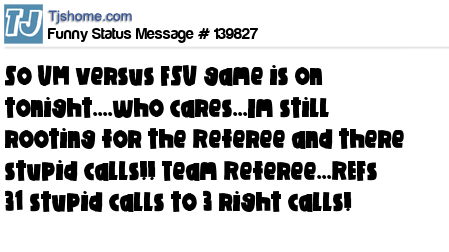 X says So UM versus FSU game is on tonight....who cares...Im still rooting for the Referee and there stupid calls!! Team Referee...REFs 31 stupid calls to 3 right calls!