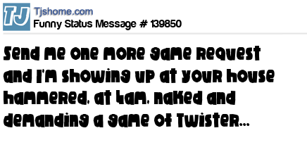 - # 152995 Send me one more game request and I'm showing up at your house drunk, at 4am, naked and demanding a game of Twister