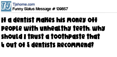 - # 201478 Why should I trust the toothpaste recommended by 4 out of 5 dentists when they're the ones who make money fixing people's teeth?