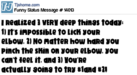 X is I realized 3 VERY deep things today: 1) It's impossible to lick your elbow, 2) No matter how hard you pinch the skin on your elbow, you can't feel it, and 3) You're actually going to try #1and #2!