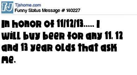 X says In honor of 11/12/13..... I will buy beer for any 11, 12 and 13 year olds that ask me.