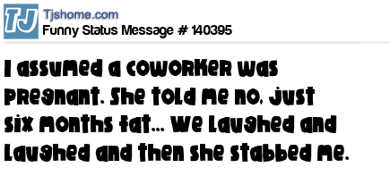 X I assumed a coworker was pregnant. She told me no, just six months fat... We laughed and laughed and then she stabbed me.