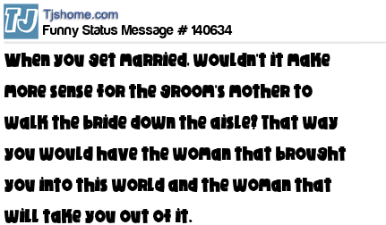 X When you get married, wouldn't it make more sense for the groom's mother to walk the bride down the aisle? That way you would have the woman that brought you into this world and the woman that will take you out of it.