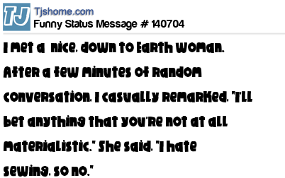 X I met a nice, down to Earth woman. After a few minutes of random conversation, I casually remarked, "I'll bet anything that you're not at all materialistic." She said, "I hate sewing, so no."