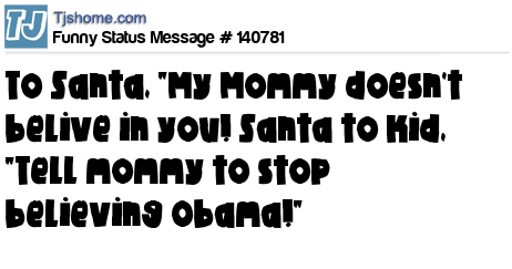 X says to Santa, "My Mommy doesn't belive in you! Santa to kid, "Tell mommy to stop believing Obama!"
