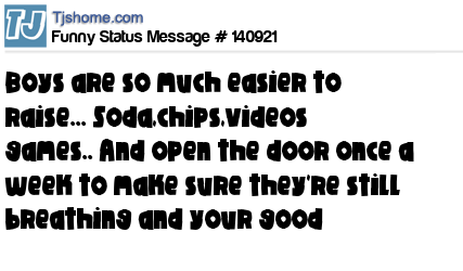 X Boys are so much easier to raise... Soda,chips,videos games.. And open the door once a week to make sure they're still breathing and your good