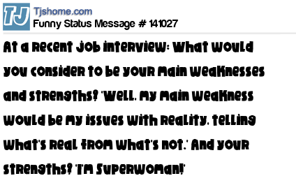 X At a recent job interview: What would you consider to be your main weaknesses and strengths? 'Well, my main weakness would be my issues with reality, telling what's real from what's not.' And your strengths? 'I'm Superwoman!'
